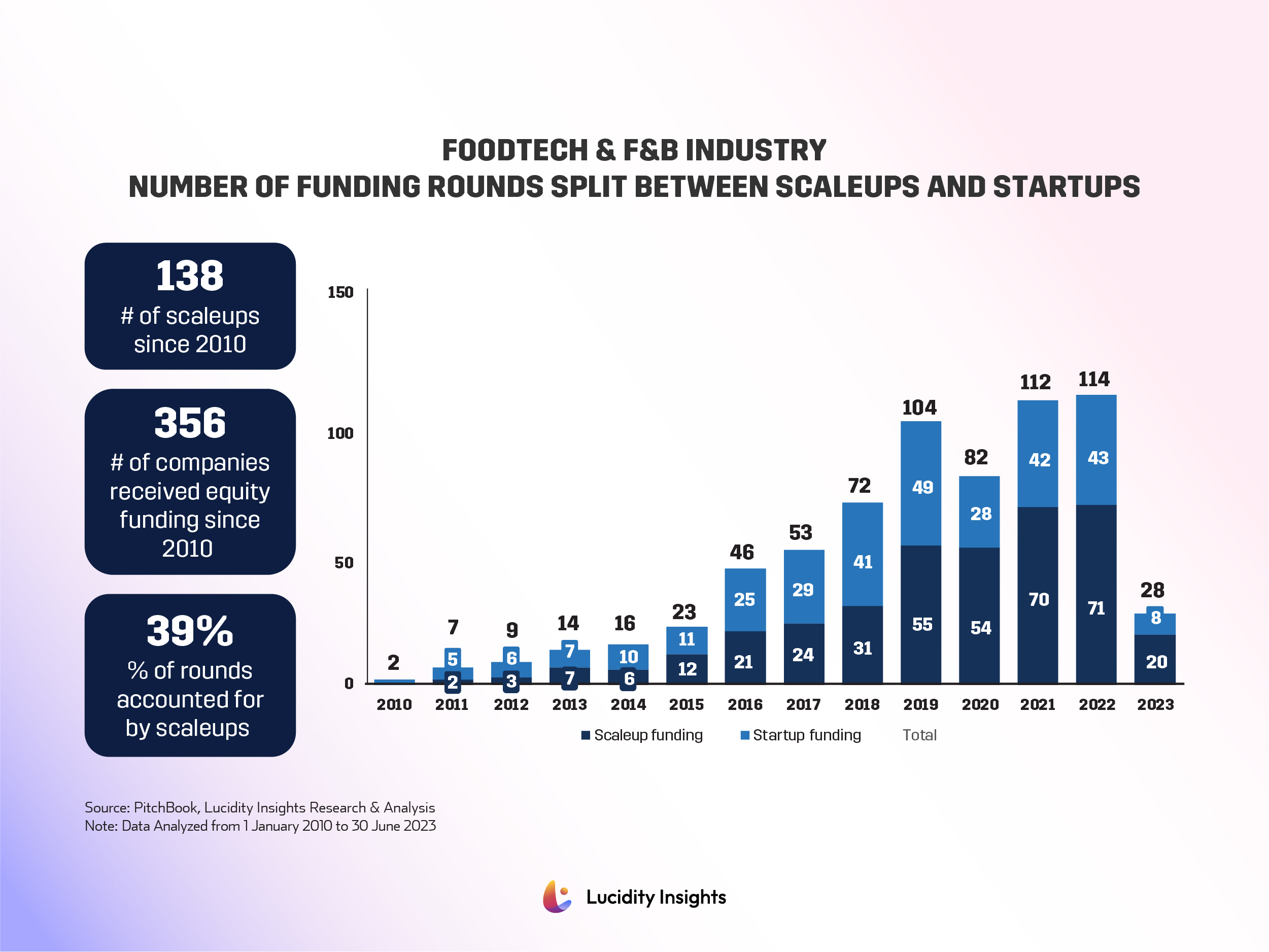 Infobyte: Foodtech & F&B Industry Number of Funding Rounds Split Between Scaleups and Startups