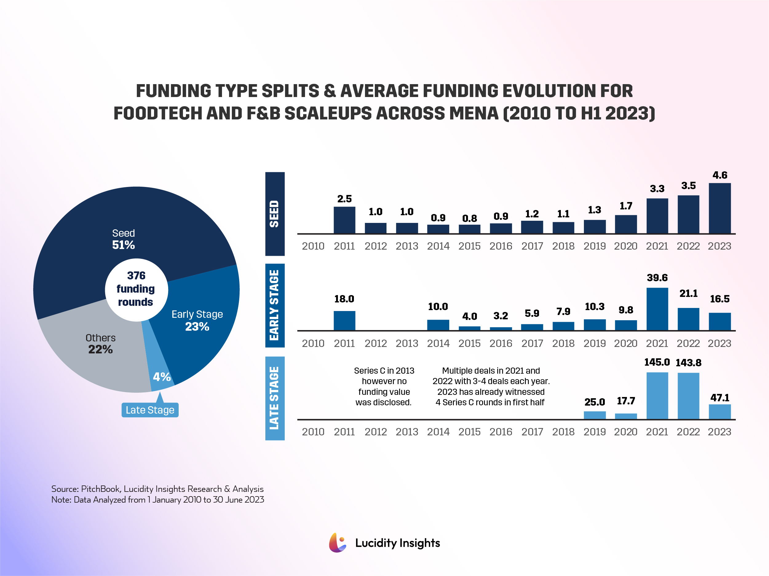 Infobyte: Funding Type Splits and Average Funding Evolution for Foodtech and F&B Scaleups Across MENA (2010 to H1 2023)