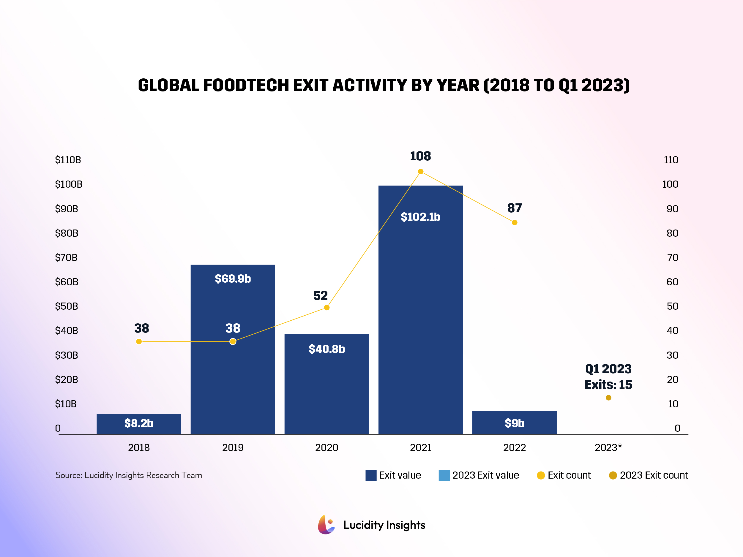 Infobyte: Global Foodtech Exit Activity by Year (2018 to Q1 2023)