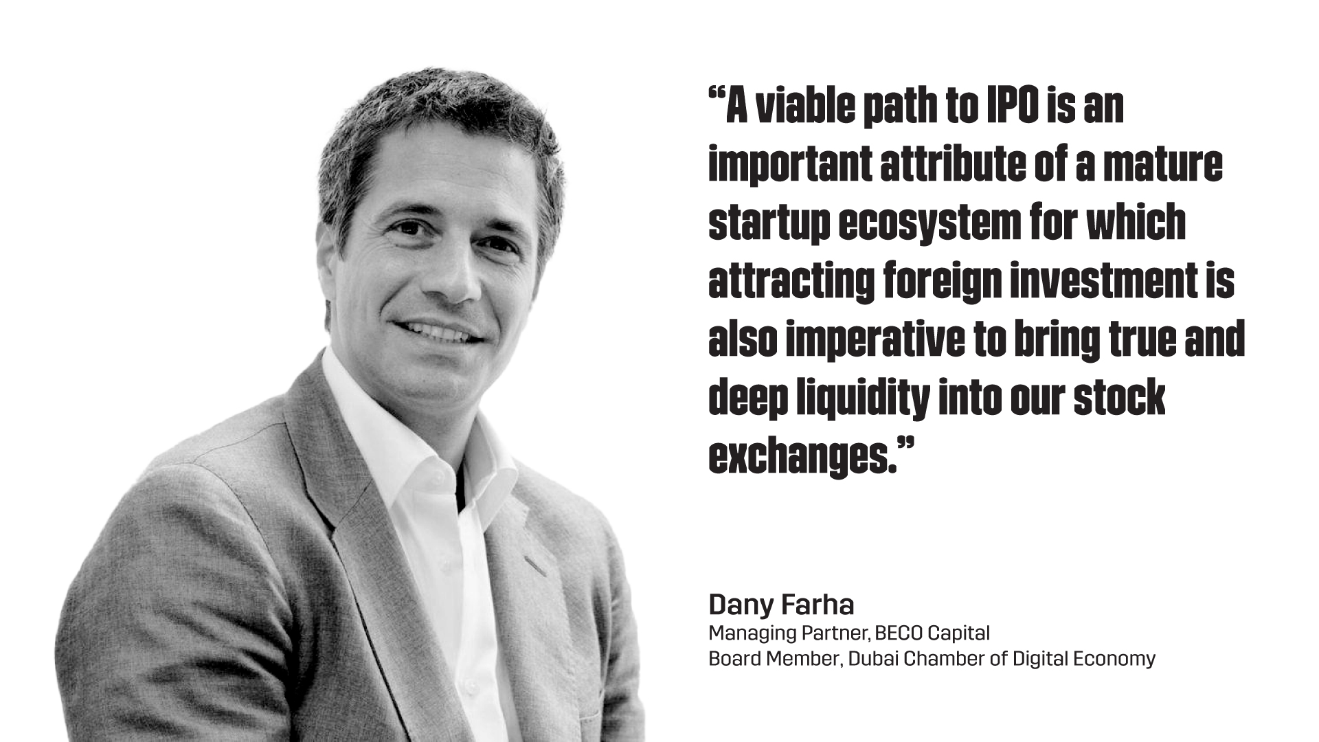 Dany Farha, Managing Partner at BECO Capital, which is established since early days from 2012 and the largest VC firm in the Emirate, posits that “a viable path to IPO is an important attribute of a mature startup ecosystem for which attracting foreign investment is also imperative to bring true and deep liquidity into our stock exchanges.” He admits that “to make it a sustainable reality, we need to ensure that there is funding across the entire startup value chain. In particular, growth stage, pre-IPO, and post-IPO.”